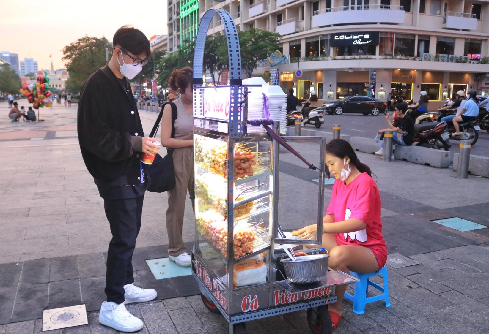Đang trò chuyện, anh Huy Dũng (26 tuổi) cùng bạn gái ghé hàng cá viên này để mua. Sau khi hỏi giá, anh quyết định mua 4 xiên và 2 ly trà đào ở hàng cạnh bên. Vị khách cho biết mình đã ăn ở đây nhiều lần và thấy mức giá tương đối hợp lý ở trung tâm. "Thực ra ăn ở đây không hẳn là vì ngon, mà là vì có không khí của phố đi bộ. Tôi không biết quán ở đây có bị bốc phốt gì không nhưng xưa giờ đi ăn tôi vẫn hỏi giá trước", anh này nói.