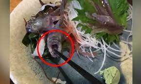 Thực khách hoang mang vì cá quá tươi sống. Khi đưa đũa lại gần, một con cá bất ngờ há miệng, gặm chặt vào đầu khiến thực khách hoang mang.