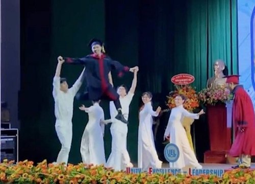 Nam sinh nhảy khi nhận bằng cử nhân. Thay vì đi lên bục thì nam sinh có một vũ đoàn chuyên nghiệp diễn cùng. Chàng sinh viên trường Đại học Kinh tế - Luật kết hợp ăn ý với đoàn vũ công, "bay" ra nhận bằng tốt nghiệp khiến cả khán phòng phì cười.