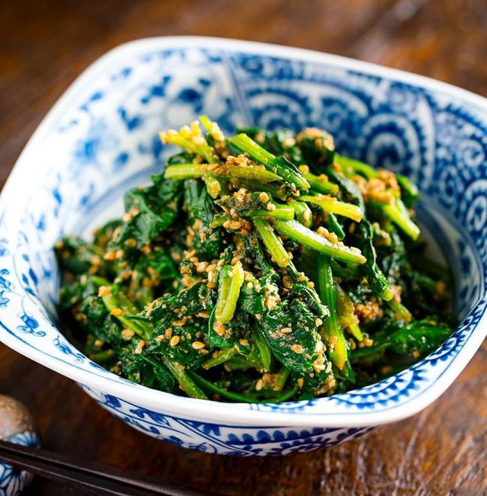 Cách làm salad cải bó xôi rất đơn giản. Đầu tiên, nhặt rau, rửa sạch. Đun sôi nước, chần rau trong khoảng 45 giây. Vớt rau ra nhúng vào bát nước lạnh, vắt kiệt nước. Cắt rau thành các đoạn dài vừa ăn. Cho vào bát, thêm nước sốt mè, mè rang giã nhỏ. Trộn đều và thưởng thức.