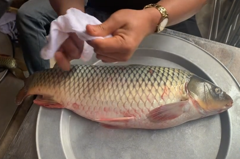 Cá làm tiệc khao lão phải được tuyển chọn kỹ càng, đáp ứng nhiều tiêu chí như: Nặng 3-4kg, mắt trong, vảy còn nguyên,... (Ảnh: @