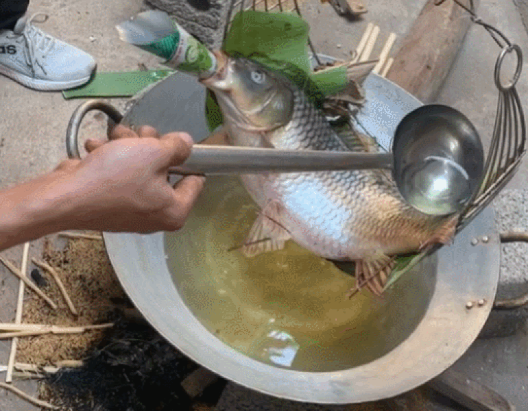 Tuy nhiên, thay vì chiên cá trong chảo như cách truyền thống, món ăn này có cách chế biến hoàn toàn khác. Võng cá được đặt ở giữa chảo mỡ, người ta dùng muôi múc mỡ đang sôi rưới đều lên toàn bộ thân cá. Với sức nóng của mỡ, cá sẽ chín dần và uốn cong rất đẹp mắt. Đến khi cá chín đều, lớp vảy vàng giòn thì nhấc ra.