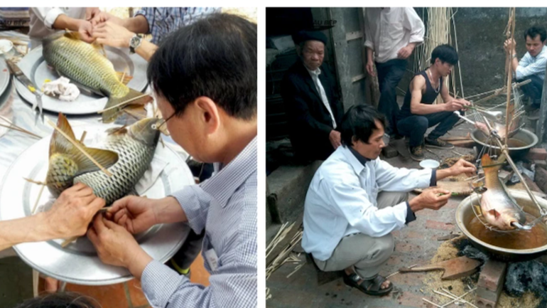 Từ thanh niên trai tráng đến người trung niên, cao tuổi trong làng Diệc đều biết làm mâm cỗ và món cá "nằm võng" để dâng lễ khao lão (Ảnh: Anh Đầu bếp).