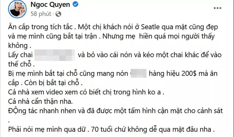 Mới đây, Ngọc Quyên chia sẻ tình huống gặp phải kẻ gian khi kinh doanh tại Mỹ. Theo nữ người mẫu chia sẻ, một người phụ nữ Việt ăn mặc sang chảnh, dùng đồ hiệu nhưng lại giở thói tắt mắt khi tới mua mỹ phẫm nhà cô.
