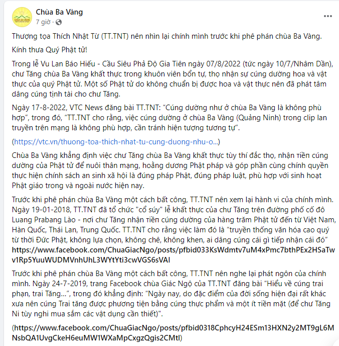 Sau phát ngôn của Thượng tọa Thích Nhật Từ, đại diện phát ngôn chùa Ba Vàng gây bất ngờ khi đăng tải bài viết đáp trả, cho rằng Thượng tọa nên xem lại hành vi của mình trước khi nói về việc cúng dường.