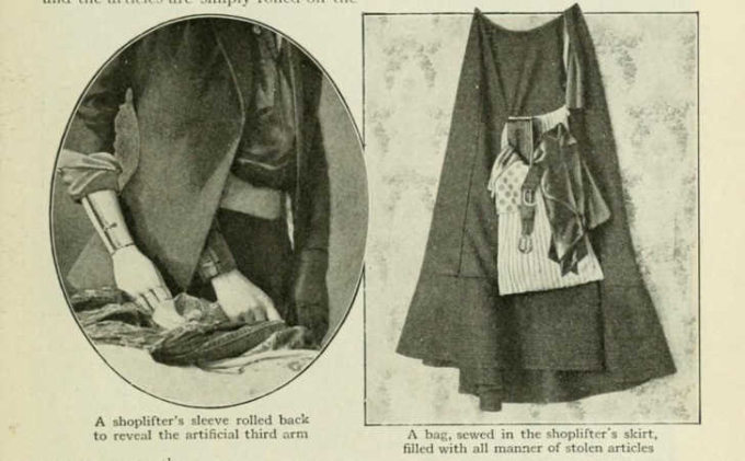 Áo khác trang bị cánh tay giả (trái) và váy khâu thêm túi bí mật, công cụ được Forty Elephants sáng tạo ra để hành nghề trộm cắp. Ảnh: Dust of time