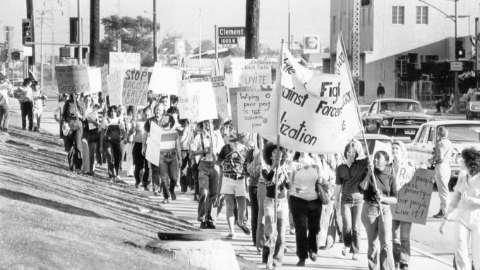 Những người biểu tình tuần hành bên ngoài Trung tâm Y tế USC của quận Los Angeles vào năm 1974 do"Ủy ban Ngăn chặn Triệt sản Cưỡng bức tổ chức. Ảnh: LA Times