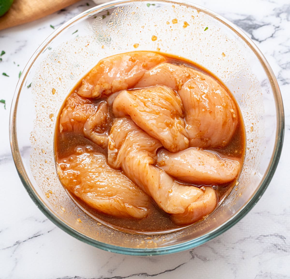 Bước 1: Trong một bát trộn lớn, trộn đều tất cả các nguyên liệu làm nước sốt với nhau, trừ thịt gà, xì dầu, nước mắm, nước cốt chanh, mật ong, gừng và tỏi.