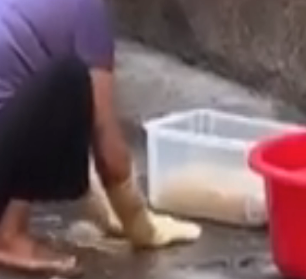 Đáng chú ý trong đoạn clip, người phụ nữ chỉ dùng ít nước xà phòng rồi nhúng qua đống xiên que sau đó...mài xuống nền đất.