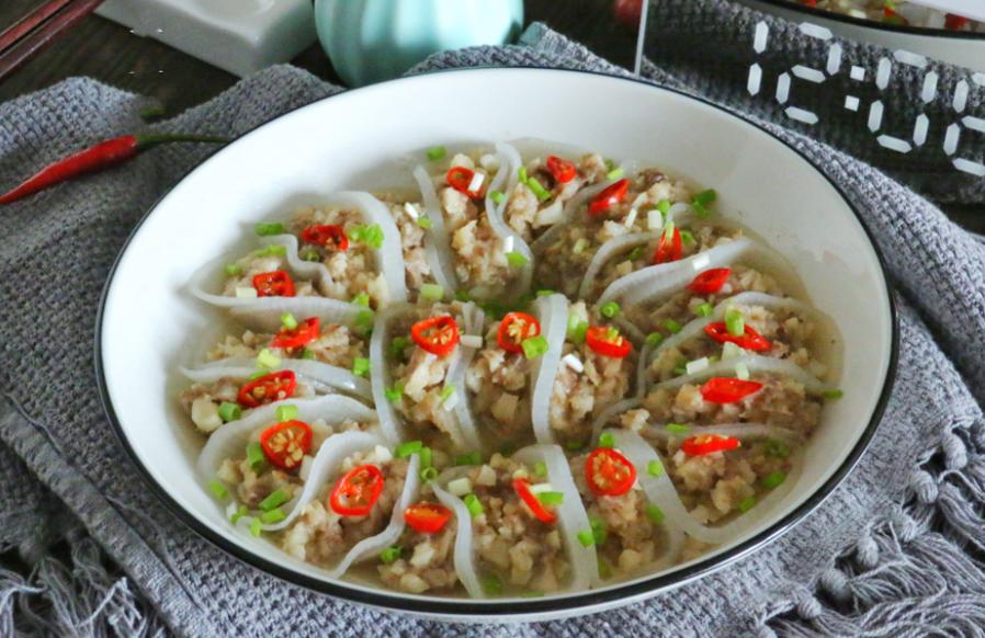 Củ cải trắng, 300g thịt heo băm, 10g tinh bột khoai lang (có thể thay thế bằng bột bắp), 5g câu kỷ tử, 10g hành lá, 2g tiêu, 2g muối.