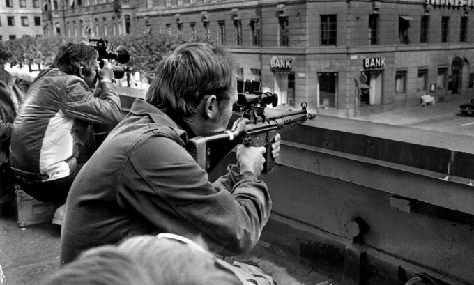 Phóng viên và cảnh sát bắn tỉa ngồi cạnh nhau trên mái nhà đối diện ngân hàng Sveriges Kreditbank, vào ngày thứ hai của vụ cướp. Ảnh: AFP