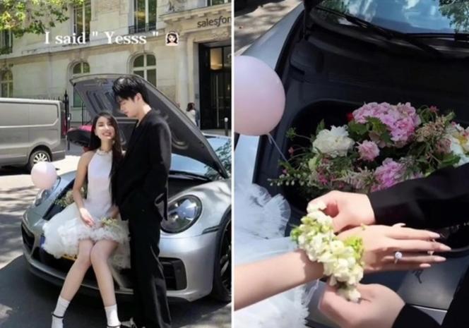 Trong video cầu hôn được lan truyền, nữ chính bước ra từ khách sạn sang chảnh ở Paris (Pháp), nam chính lái Porsche đến đón. Ban đầu cô gái chỉ nghĩ cả 2 sẽ cùng nhau đi ăn tối mừng sinh nhật muộn nhưng chàng trai bất ngờ mở cốp xe đầy hoa và quỳ một chân xuống cầu hôn: “Lấy anh nhé!”.