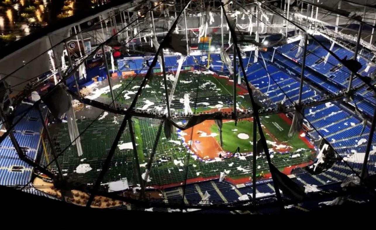 Mái sân vận động bóng chày ở thành phố Tampa bị xé toạc trong bão Milton. Ảnh: CNN