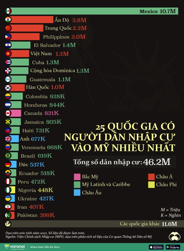Năm 2022, Mỹ có hơn 46 triệu dân nhập cư, chiếm gần 14% tổng dân số. Đồ thị thông tin dưới đây gồm 25 quốc gia có số người nhập cư vào Mỹ nhiều nhất, dựa trên phân tích Khảo sát Cộng đồng Mỹ năm 2022 của Viện Chính sách nhập cư (MPI).