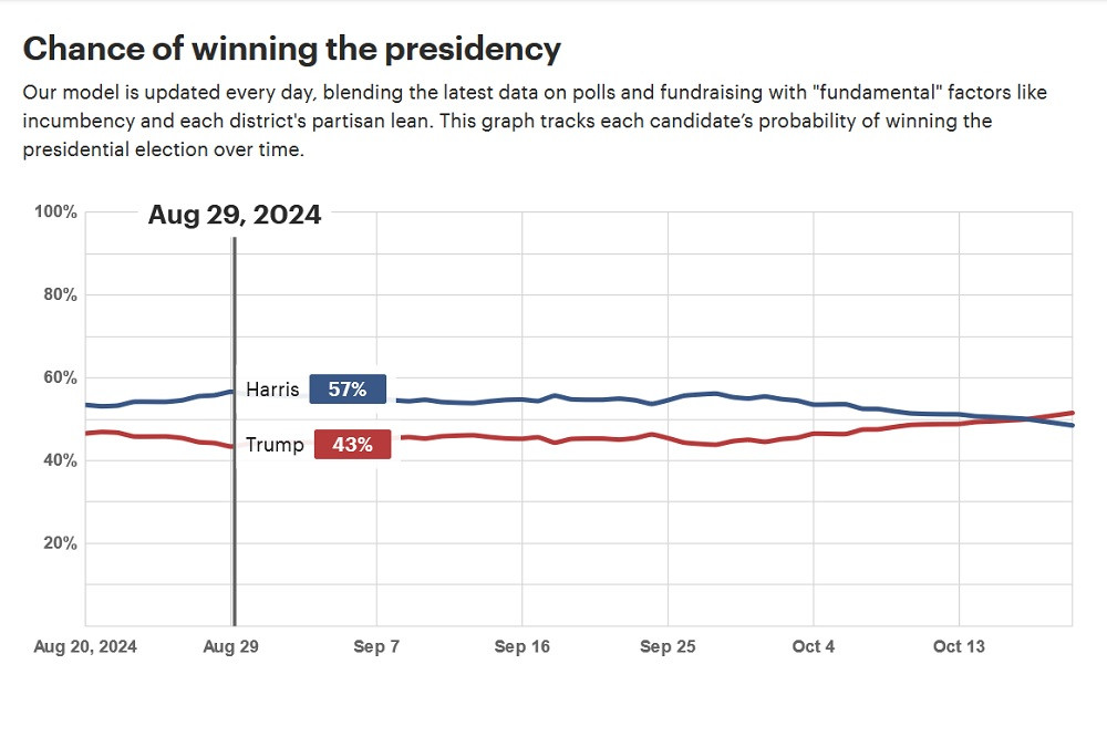 Tuy nhiên kể từ ngày 16/10 tới nay, cơ hội chiến thắng của ông Trump dần ngang bằng, và tới ngày 20/10 thì lần đầu vượt đối thủ Harris.