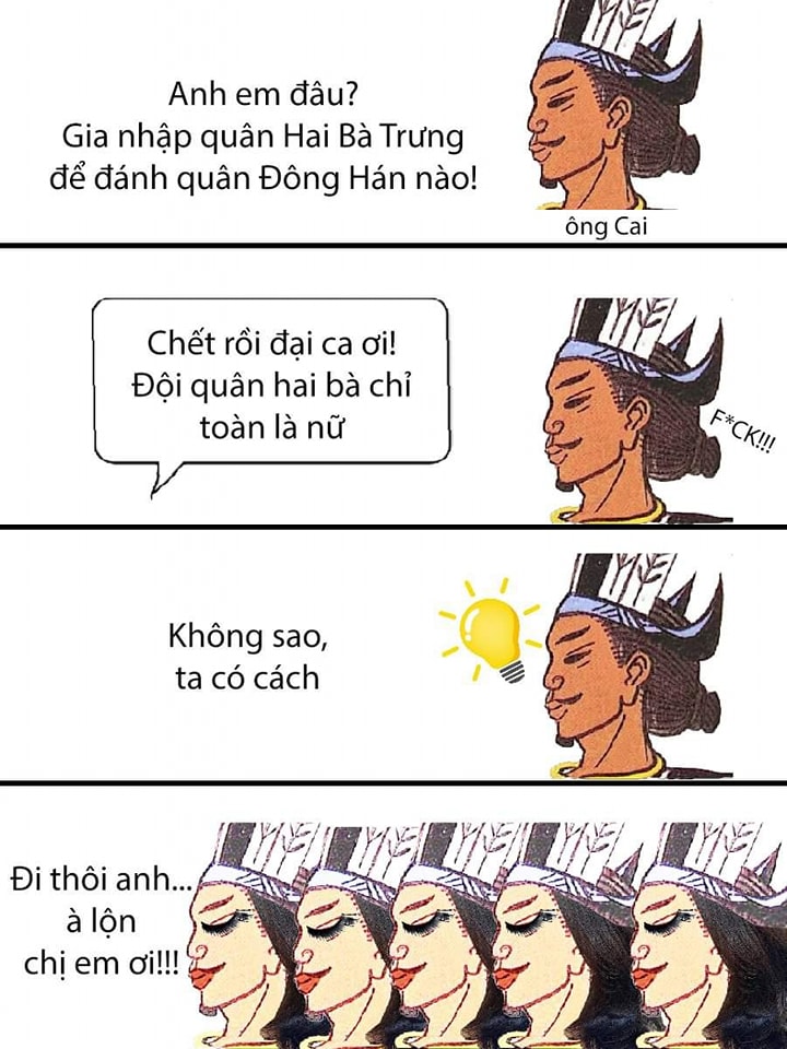 Chỉ trong vòng 15 ngày, Cai Công đã chiêu mộ được rất nhiều nghĩa binh, rồi tất cả cùng nhau giả gái hết sạch. Ai mà ngờ đội quân cải trang này xịn dữ vậy. Hợp với quân Hai Bà Trưng, họ đạp tên thái thú Tô Định cút khỏi đất Việt luôn. Khi hai bà lên ngôi vua, Cai Công được phong Khai quốc Đại nguyên soái.