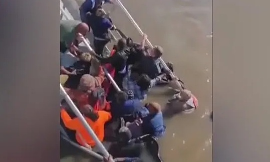 Hơn chục người bám được vào phần cầu tàu sót lại và những người trên bờ đang hối hả tìm cách kéo họ lên. Trong video là tiếng phụ nữ la hét hoảng loạn "Làm ơn, Chúa ơi", "Ôi Chúa ơi, cô tôi đâu rồi".