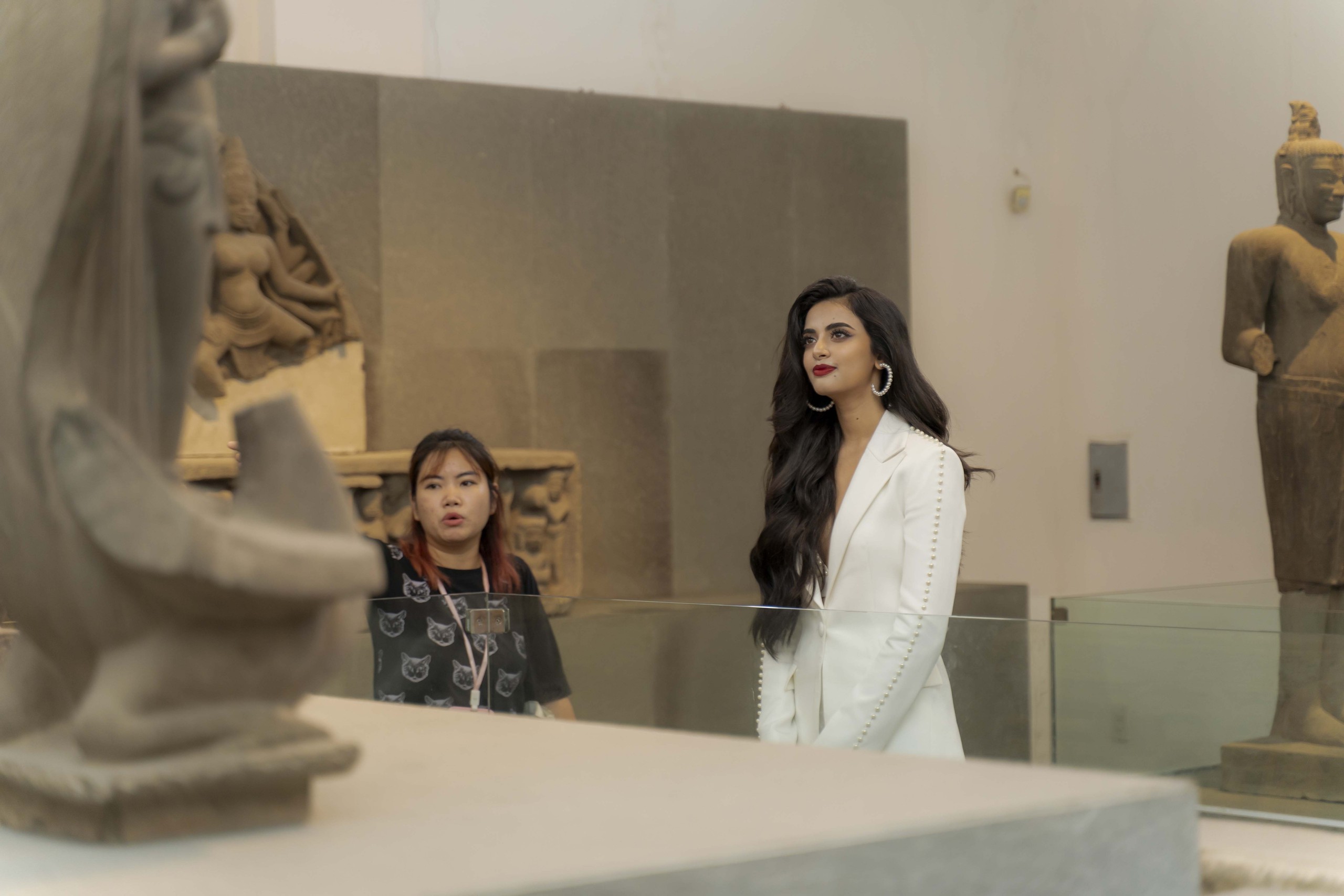 Hoa hậu Rhea Singha tham quan bảo tàng điêu khắc Chăm.