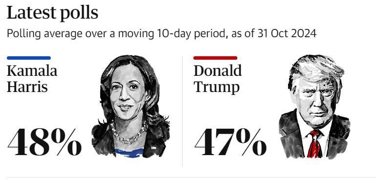 Vào ngày 5 tháng 11 năm 2024, hàng triệu người Mỹ sẽ đi bỏ phiếu để lựa chọn giữa Kamala Harris và Donald Trump cho chức tổng thống Hoa Kỳ. Hai ứng cử viên đă đưa ra những tầm nh́n hoàn toàn khác nhau về tương lai của quốc gia. Khi cuộc bầu cử bước vào giai đoạn cuối, Guardian US đang tính trung b́nh các cuộc thăm ḍ toàn quốc và tiểu bang để xem hai ứng cử viên này đang thể hiện như thế nào.