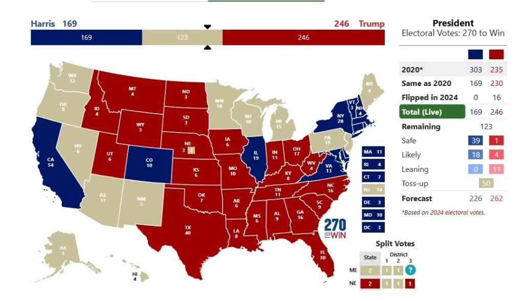 Tính tới 11h ngày 6/11 (giờ Việt Nam), theo cập nhật từ trang 270 to Win, ứng cử viên Donald Trump của đảng Cộng hòa đã giành được 246 phiếu đại cử tri, trong khi đối thủ Kamala Harris của đảng Dân chủ đang tăng tốc và giành được 162 phiếu.