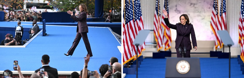 Trước bài phát biểu này, trang phục vận động tranh cử cuối của bà Kamala Harris được định hình bằng sự kết hợp giữa bộ đồ Capitol Hill và quần denim giản dị. Những bộ trang phục được bà kết hợp áo khoác blazer màu đen, xanh navy và nâu dừa với quần jeans ống loe thoải mái.