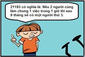 - Thưa cô: 21193 có nghĩa là "Nếu 2 người cùng làm chung 1 việc trong 1 giờ thì sau 9 tháng sẽ có một người thứ 3