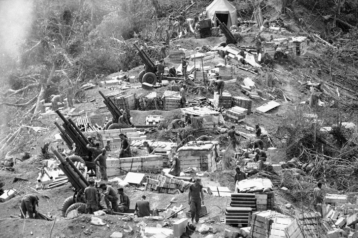 Ở phía Tây Huế, Đội Thủy Quân Lục Chiến đang chuẩn bị súng pháo 105mm để chiến đấu với Việt Cộng. Huế 18-2-1969.