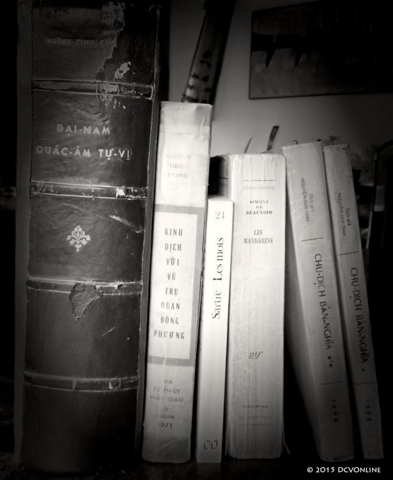 Sách của ông tôi, bạn chỉ ngắm không thôi cũng đă thấy thích. Những cuốn tự điển của Pháp, của Việt, thư pháp của Trung Hoa, những sách thuốc, sách khoa học, những bộ tiểu thuyết của các nhà văn danh tiếng, những sách học làm người, những sách triết…đứng sát bên nhau phơi cái gáy mạ vàng như cả một đội ngự lâm quân thông thái và oai vệ. Trang nghiêm nhưng không lạnh lẽo, bọn họ là thầy là bạn của ông tôi. Và v́ vậy, bạn cũng như tôi chỉ được phép đứng nh́n mà thôi.