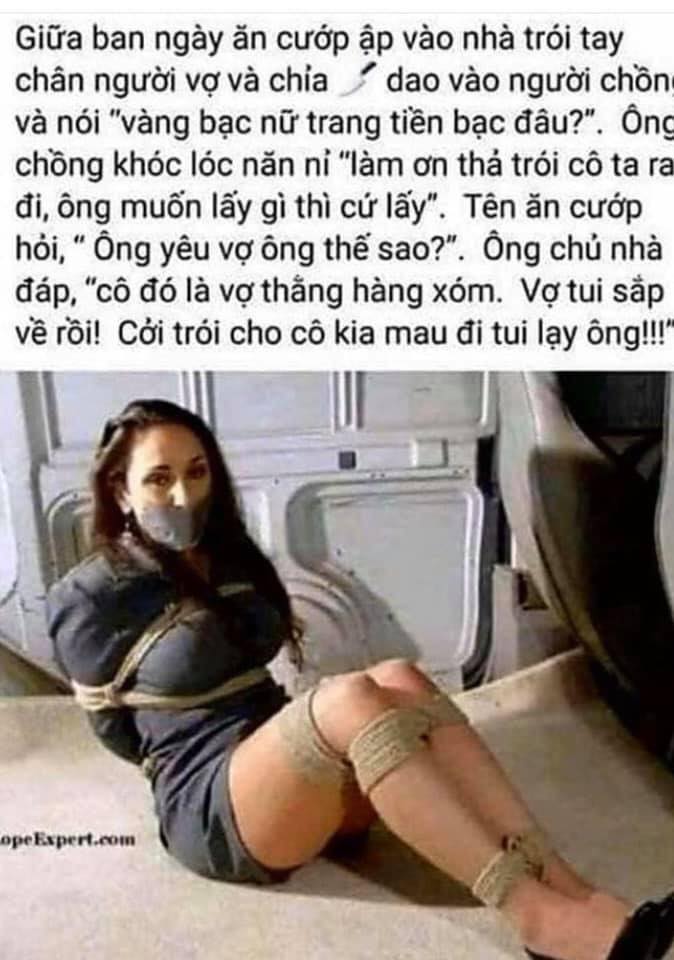 – Chồng: không biết bằng cách nào mà con vợ trói được tay thằng chồng