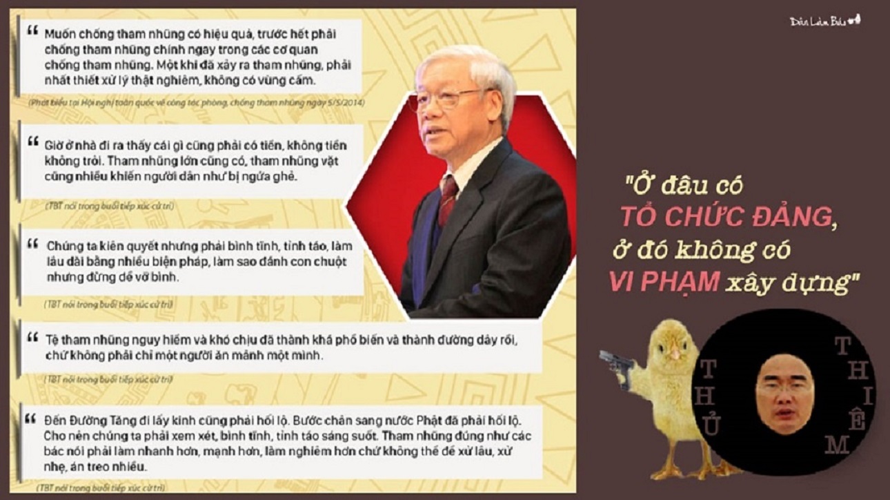 “Đi tìm trách nhiệm...đó là chuyện là các quan chức tham nhũng có cùng kiểu giải thích về sự giàu có của mình là từ buôn chổi đót, bán cây cảnh. Cách quan chức tham nhũng na ná nhau, đến khi giải thích thì lại kết tiếp thành một bè lũ dựa vào nhau”.....