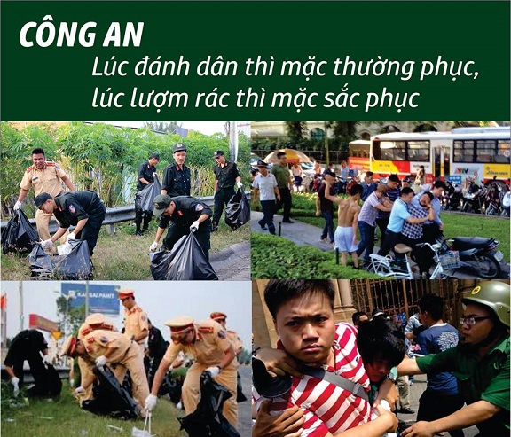 Côn an đi lượm rác .Khi đánh dân thì mặc thường phục đi lượm rác mặc sắc phục để khoe cho dân ,dân đã biết lủ bò vàng,bò xanh là hèn với giặc ác với dân rồi...