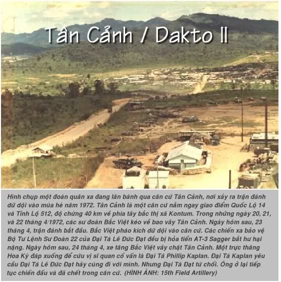 Đến 23 giờ, cánh quân tiền phương của Cộng quân được phát hiện cách quận Dakto chừng một cây số về hướng Tây với sự yểm trợ của 3 chiếc T54. Lập tức phi cơ AC130 cất cánh từ phi trường Nha Trang bay đến oanh kích và bắn cháy ngay 3 chiến xa này khi còn cách Dakto chừng 500 mét, nhưng không ngăn được bước tiến của toán tiền phương địch. Đúng nửa đêm, Cộng quân ào ạt tấn công tiền đồn Tân Cảnh.