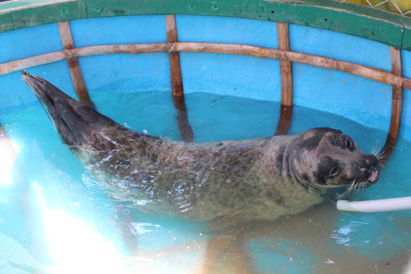 Con hải cẩu này được anh Thảo nuôi trong chiếc thuyền thúng chờ bàn giao