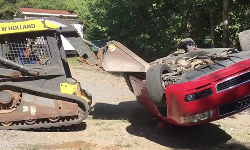 Đoạn video cho thấy ông lái chiếc máy đào đất của mình đè bẹp nóc chiếc xe sang màu đỏ, kính chắn gió, cửa, cốp xe và nắp capô trước khi lật ngược nó nhiều lần.