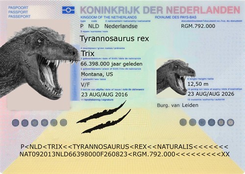 Nhiều người đã vô cùng bất ngờ khi thấy cuốn hộ chiếu của chú khủng long bạo chúa Trix được nhà chức trách Hà Lan cấp. Cuốn hộ chiếu kỳ lạ nhất thế giới này sẽ giúp cho chú khủng long Trix được vận chuyển bằng máy bay Boeing 747 từ Mỹ tới Hà Lan. Sắp tới bộ xương của hú khủng long này sẽ được trưng bày ở bảo tàng Leiden.