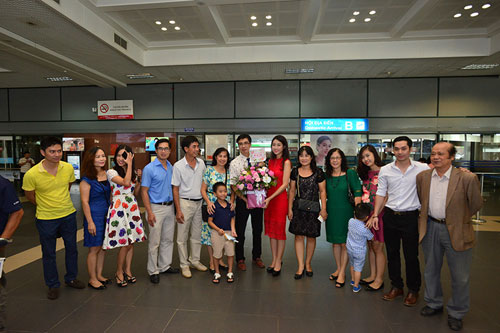 Chuyến bay chở hoa hậu Đỗ Mỹ Linh dù 11 giờ 30 phút mới hạ cánh tuy nhiên ngay từ sớm bạn bè, người thân về đây để chờ đón cô tân hoa hậu.