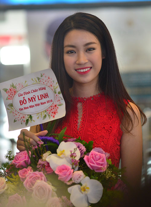Hoa hậu Đỗ Mỹ Linh rạng rỡ ở sân bay Nội Bài.