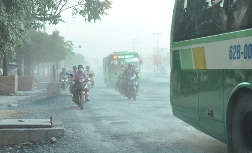 Mỗi khi có xe ô tô chạy qua, bụi bay mù mịt. Người đi xe máy thì vất vả tránh bụi. Rất nhiều người phải nhắm mắt, bịt mũi và tăng ga để chạy xe máy qua khu vực bụi, rất nguy hiểm.