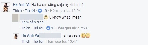 Ngay sau đó, mọi người lại tiếp tục đọc được bình luận của siêu mẫu Hà Anh :"Haha em cũng chịu hy sinh nhỉ!" khiến nhiều người không hiểu "ngụ ý" Hà Anh muốn nói.