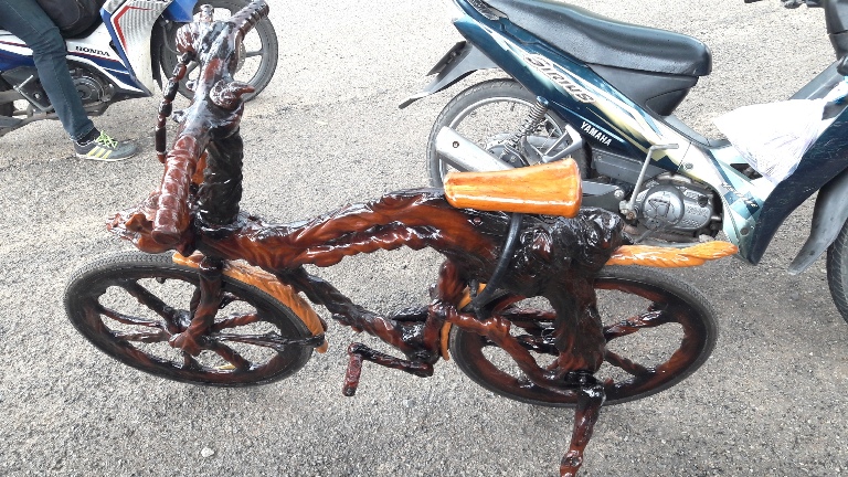 Ngoài chiếc xe gắn máy, ông Sơn còn chế tạo thêm chiếc xe đạp cũng hoàn toàn bằng gỗ sao và gỗ trai độc đáo.