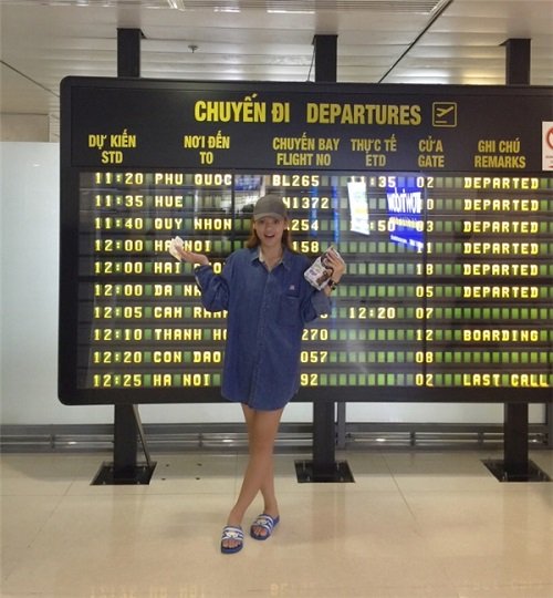 Phong cách này thậm chí còn được Mai Ngô không ngần ngại áp dụng với thời trang sân bay, nơi mà vốn dĩ các sao đua nhau "đọ" vẻ đẳng cấp, sang chảnh.