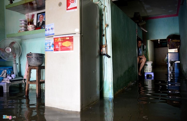 Các khu trọ lụp xụp ở vị trí thấp trũng trong khu vực này cũng lâm vào cảnh tương tự. Nước vẫn bao vậy từ ngoài sân vào đến các phòng.