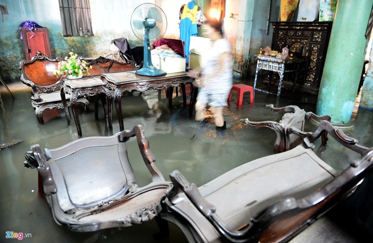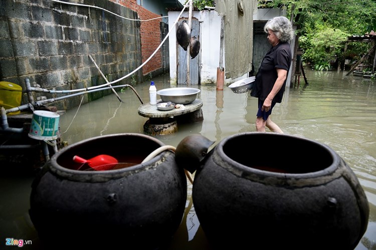 Mọi sinh hoạt của gia đình bà đều phải lội trong nước để đi lại. "Không thể bơm được, phải chờ 2-3 ngày nước mới rút hết được. Nếu mưa to nữa thì chưa biết khi nào gia đình tôi mới trở lại cuộc sống bình thường", người phụ nữ gần 70 tuổi này, ngán ngẩm.