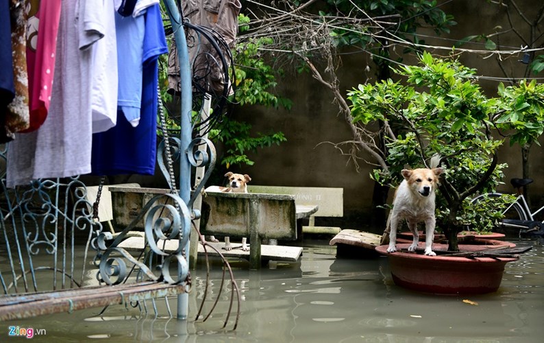 Từ trong nhà đến ngoài vườn nhà bà Nguyễn Thị Út (số 523/3, Kha Vạn Cân) chìm trong nước bẩn. Những chú chó không thể chạy nhảy, chỉ đứng một chỗ trên chậu hoa, ghế đá từ suốt đêm qua đến trưa nay.