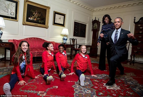 Khi gặp Simone Biles và nhóm vận động viên thể dục dụng cụ, ông Obama đă bắt chước động tác xoạc chân của họ. Biles, 19 tuổi, là vận động viên nữ đầu tiên đoạt ba huy chương vàng trong một kỳ Olympic nội dung thể dục dụng cụ, lập kỷ lục mới cho nước Mỹ.