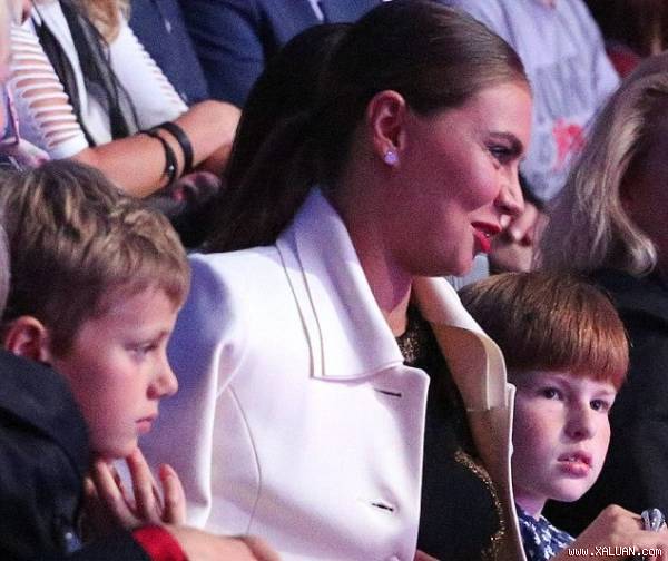 Alina Kabaeva, 33 tuổi, từng đoạt HCV Olympic ở môn thể dục nhịp điệu, bị đồn có quan hệ tình cảm với Tổng thống Nga từ năm 2008, dẫn 2 bé trai, chưa rõ tuổi tác, tới xem một trận đấu của môn khúc côn cầu trên băng.
