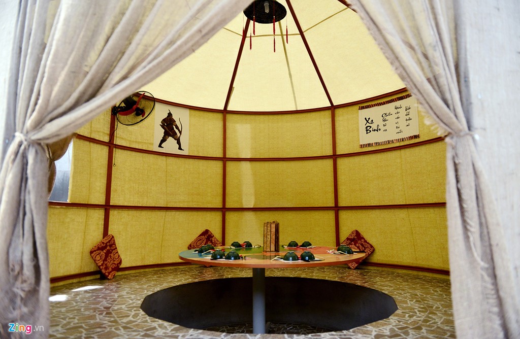 Những lều trại nhỏ thiết kế hình tròn có thể chứa hàng chục khách. Trên bàn vẽ bản đồ các trận đánh của ba nước Ngụy, Thục, Ngô.