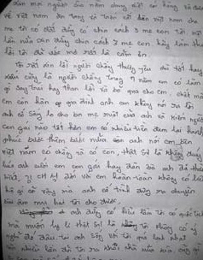 Tôi đã cho chồng tôi nhiều cơ hội sửa chữa mà không được. Muốn sống một cuộc sống đầm ấm, hạnh phúc nhưng chồng tôi quá hiểu lầm. Chỉ có cách chết 3 mẹ con tôi mới bên nhau mãi mãi. Mẹ con tôi chết xin mọi người mang về Việt Nam chôn chung, đừng chia cách 3 mẹ con tôi”.