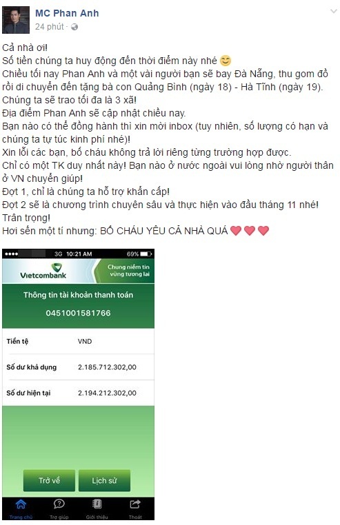 Sau 4 tiếng kêu gọi, Phan Anh thông báo đã có hơn 2 tỉ đồng quyên góp cho đồng bào miền Trung