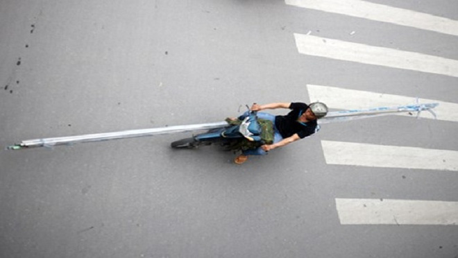 Trên đường phố đông đúc, chiếc xe máy chở theo chiếc xà beng nhọn hoắt chĩa về phía sau khiến bao người sợ hãi.